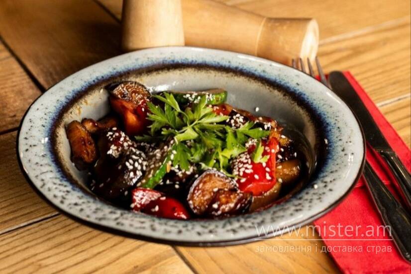 Ніжна телятина обсмажена з баклажанами в соусі унагі з додаанням свіжого огірка, болгарського перцю, кунжута та зелені.