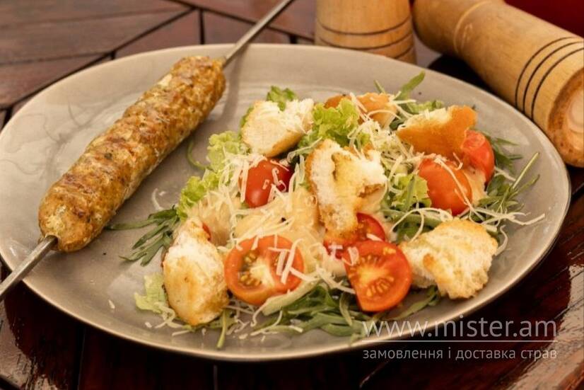 Обсмажений на грилі люля-кебаб з мікс салатом, пармезаном, томатами чері, сухариками з багету та пармезановим соусом.