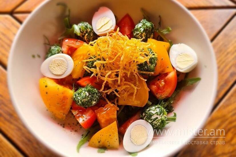 Руккола, жовтий помідор, червоний помідор, кульки крем-сиру в паніровці з зелені, перепелині яйця та картопля пай, заправляється пряним, зеленим маслом.
