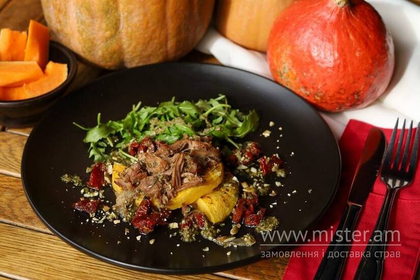 Стейк з гарбуза з рваною телятиною, руколою та базиліковим соусом