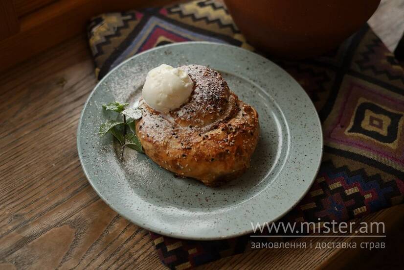 Традиційний татарський пиріг з легкого тіста, гарбуза та волоських горіхів, подається з кулькою морозива.