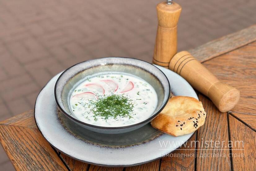 Традиційна кримськотатарська окрошка з телятиною, огірком, редисом, яйцем та заправлена айраном з гірчицею, подається з зеленню.