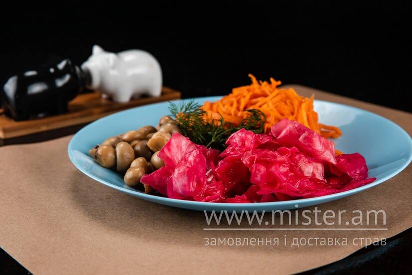 Мариновані печериці, квашена капуста та мариновані огірки, подається з червоною цибулею та зеленню.