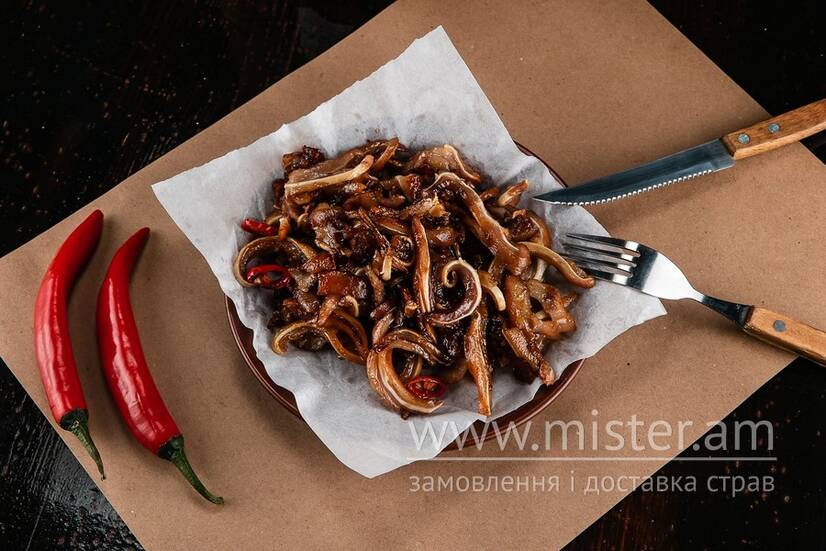Обсмажені копчені свинячі вуха з соєвим соусом, часником та перцем чілі.