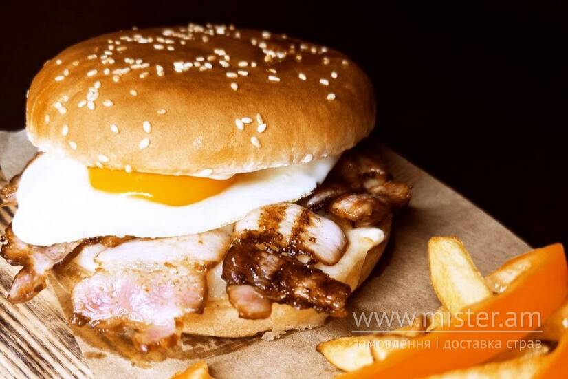 Велика мʼякенька булочка з кунжутом, розтоплений сир сулугуні, смажені на грилі печериці, хрусткий бекон, яєчко, що розтікається, доповнюється картопелькою фрі та смужками свіжого солодкого перцю.