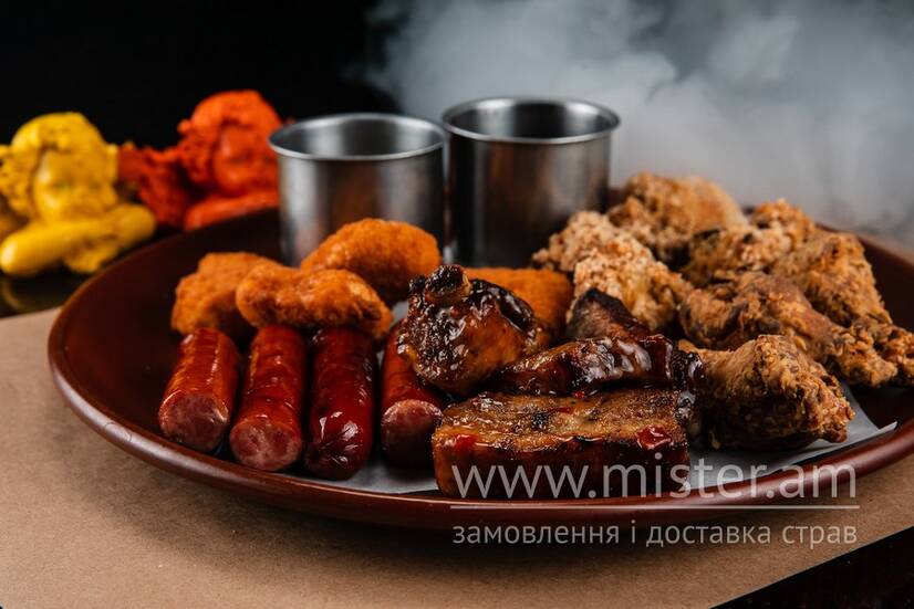 Сосиски баварські на грилі, крила курячі, нагетси, печериці, ребра, соус часниковий, соус BBQ.