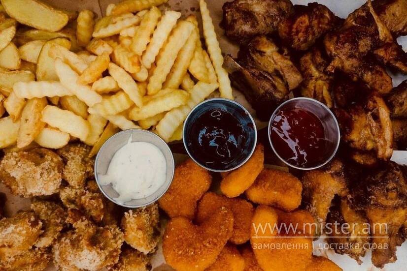 Мариноване м'ясо (свинина та куриця) обсмажена на грилі, крила, м'ясні свинячі ребра, нагетси, печериці фрі, картопля фрі, картопля по-селянськи, подається з соусом BBQ та часниковим.