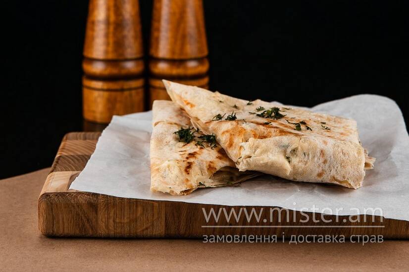 Лаваш приготовлений на грилі з сиром сулугуні, томатом та зеленю.