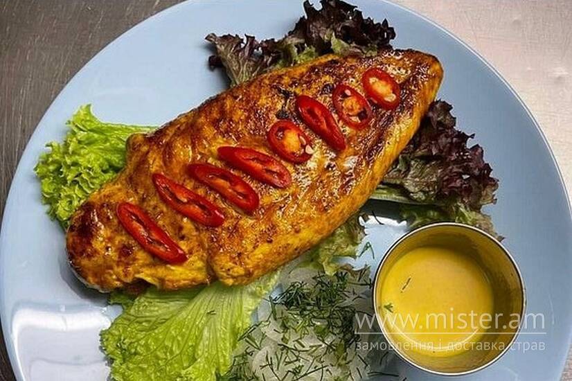 Ніжний стейк з лосося обсмажений на грилі з соусом теріякі, помідором чері та лимоном, подається з сирним соусом.