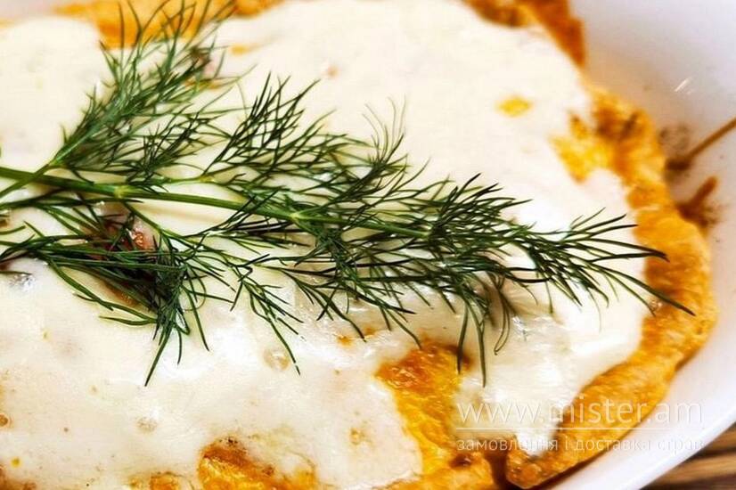 Листкове тісто запечене з ніжним омлетом, вершками, помідором, болгарським перцем, сиром моцарела та зеленню.