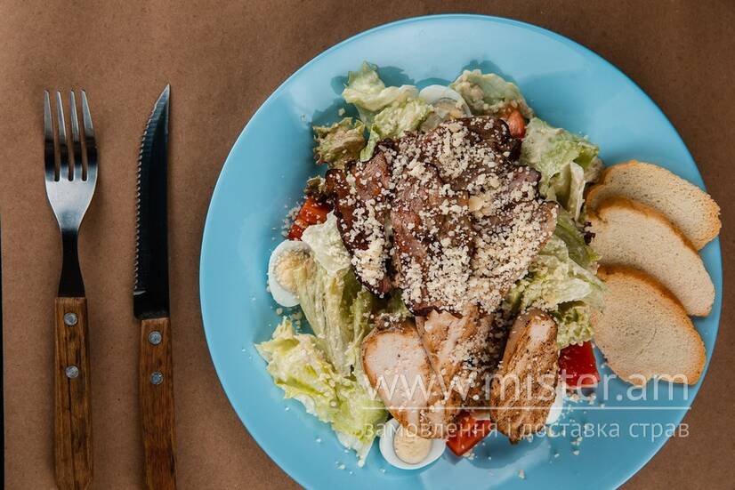 Мікс салату, помідори чері, яйце перепелине, філе куряче на грилі, смажений бекон, сир пармезан, хрумкий багет, соус Цезар власного приготування.