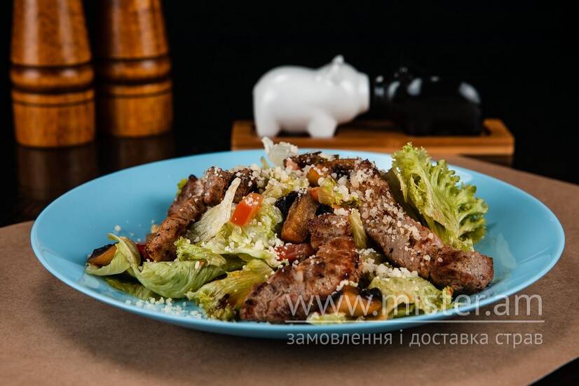 Мікс салату, свинина на грилі, печериці, маринований огірок, помідор, сир пармезан, спеції, соус світ-чілі.