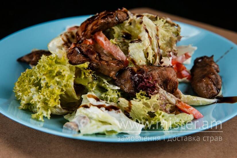 Мікс салату, телятина на грилі, помідор, перець болгарський, печериці, копчений йогурт, соус соєвий, спеції, кунжут.