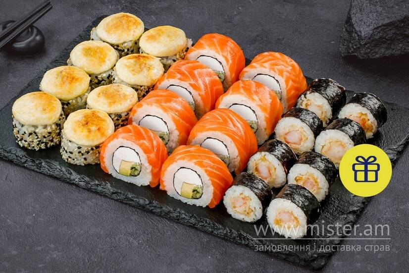 - Соєвий соус - 80 мл (2 шт). Імбир - 20 г. Васабі - 10 г.