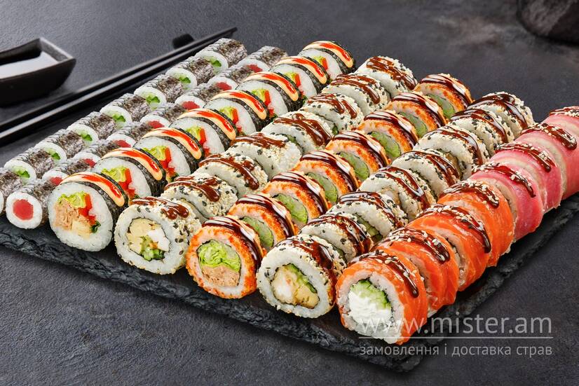 - Соєвий соус - 120 мл (3 шт). Імбир - 40 г. Васабі - 20 г.