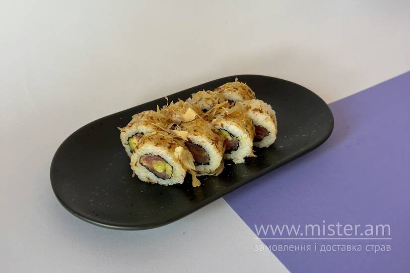 Рис, авокадо, тунець, соус спайсі, стружка тунця, норі.