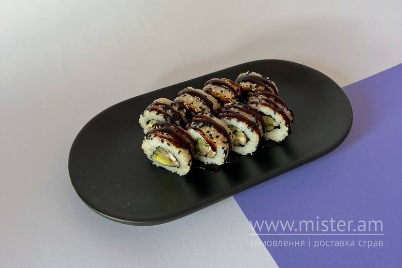 Рис, огірок, авокадо, вугор, кунжут мікс, соус унагі, норі.