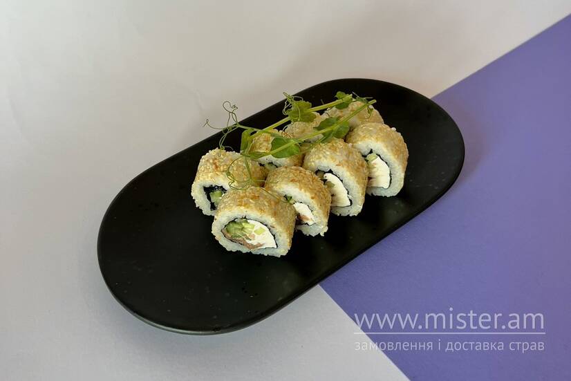 Рис, сир філадельфія, лосось, огірок, кунжут білий, норі.