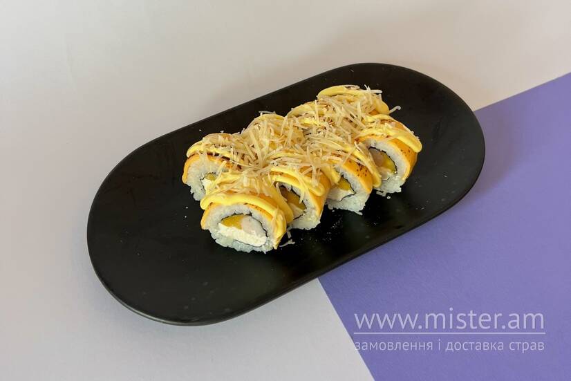 Рис, сир філадельфія, манго, креветка, сир чеддер, сирний соус, пармезан, норі.