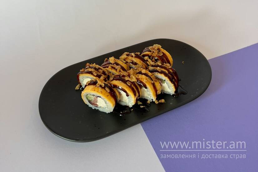 Рис, сир філадельфія, огірок, тунець, сир чеддер, кріспі, соус унагі, норі.