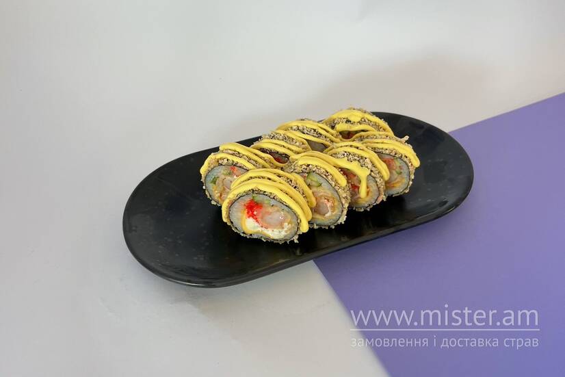 Рис, норі, креветка, огірок, масаго червона, сир чеддер, сир філадельфія, сирний соус, паніровка панко.