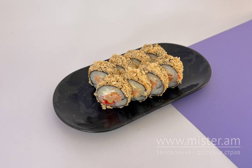 Норі, лосось, авокадо, масаго червона, рис, сир філадельфія, паніровка панко.