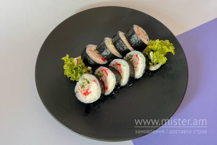 Рис, норі, сир філадельфія, масаго червона, лист салату, креветка, огірок.