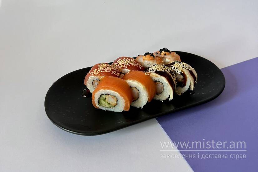 Рис, лосось, тунець, вугор, огірок, креветка,соус унагі, кунжут білий, кунжут чорний, соус спайсі, норі.
