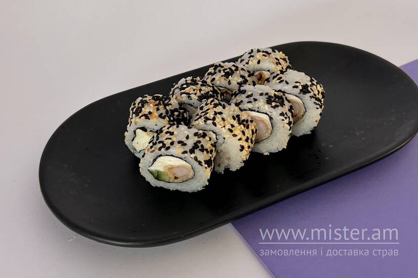 Рис, огірок, сир філадельфія, креветка, кунжут мікс, норі.