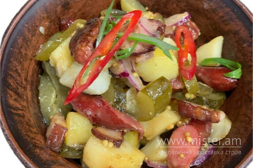 Ковбаски, бекон, огірок с/с, картопля, цибуля салатна, гірчична заправка.