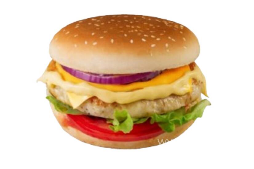 Куряча котлета, сир Чеддер, помідори, цибуля, айсберг, соус, велика булочка в кунжуті.