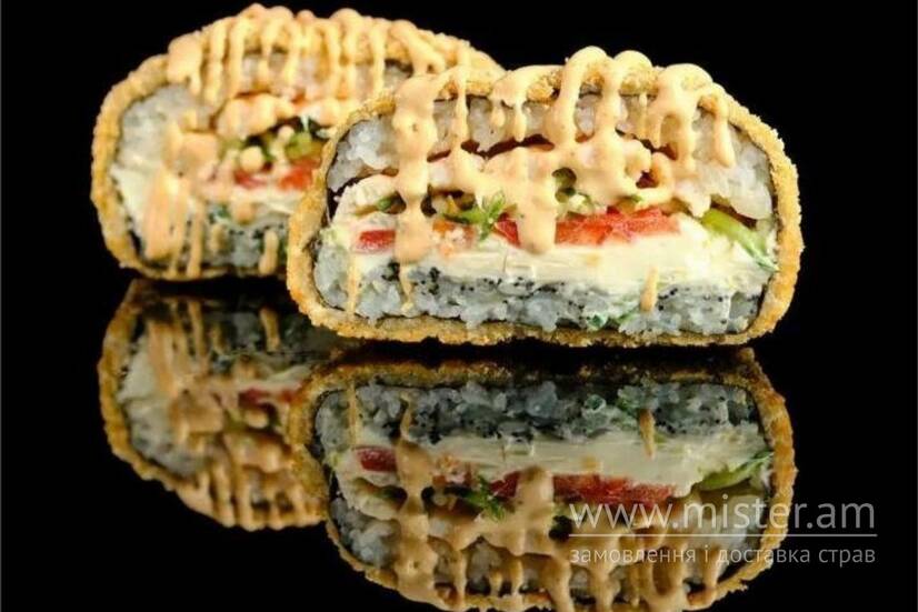 Тигрові креветки, ікра масаго, огірок, томати, крем-сир, соус спайсі, рис.