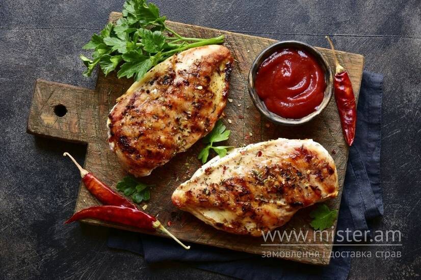 Куряче стегно у соусi барбекю з копченими томатами, перцем чилі та гірчицею.