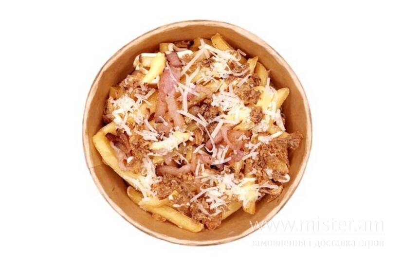 Картопля фрі, бекон, сирной соус, пармезан, цибуля темпура.