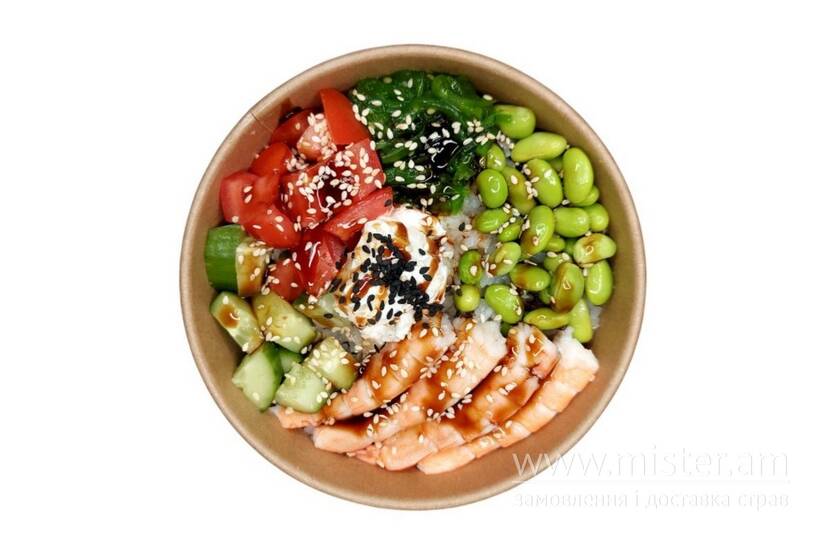 Рис, крем-сир, заправка, огірок, томати, тигрова креветка, боби едамаме, чука, кунжут.