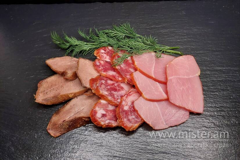 Свинний язик гриль, балик, фермерська сиров'ялена ковбаса за італьянською рецептурою.