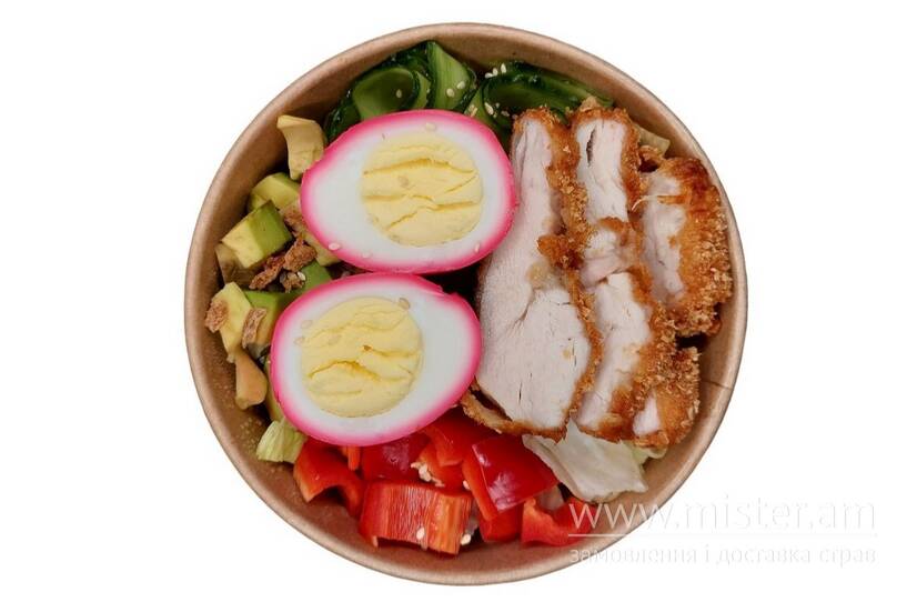 Салат айсберг, куряче філе темпура, болгарський перець, огірок, цибуля темпура, кунжут, авокадо, імбирно-цитрусова заправка.