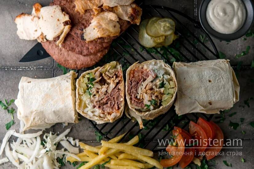 Мікс м'яса, а саме філе курочки гриль та шашлика зі свинного ошийка, картопля фрі, молода/пекінська капуста, помідор, свіжий огірок, зелень, фірмовий соус.