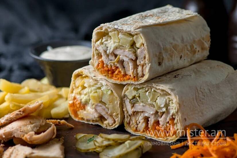 Мариноване куряче філе, картопля фрі, морква по-корейськи/молода, пекінська капуста, свіжий огірок, фірмовий соус.