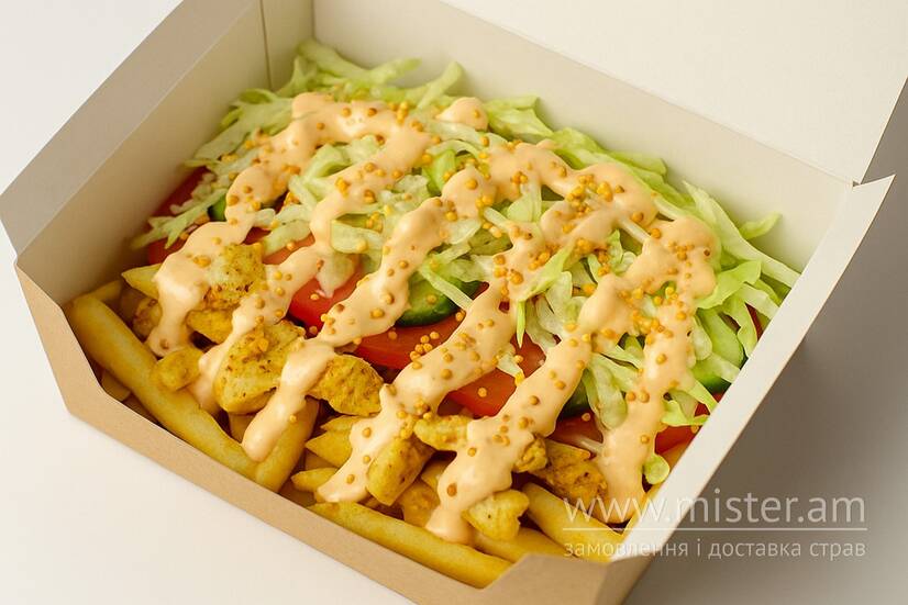 Картопля запечена в аерофритюрі, філе куряче запечене, айсберг, помідор, огірок, соус діжон (подається окремо).