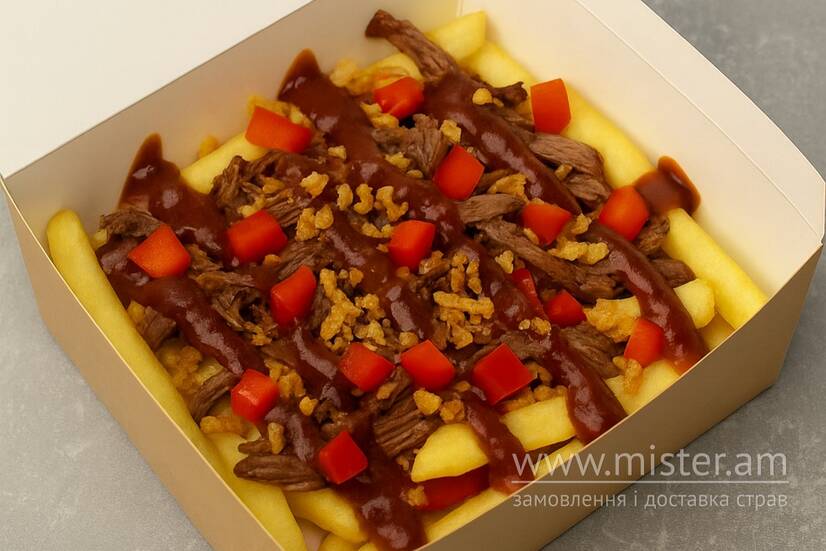 Картопля запечена в аерофритюрі, томлена яловичина, перець солодкий, цибуля кріспі, соус барбекю (подається окремо).
