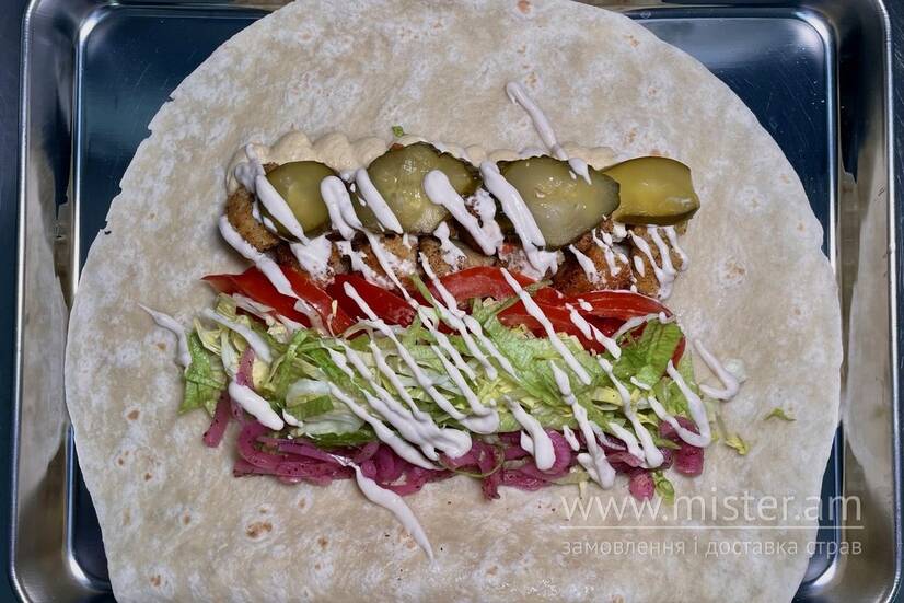 Лаваш, хумус, подвійний фалафель, солоний огірок, свіжі томати, салат айсберг, цибуля сумах, соус часниковий.