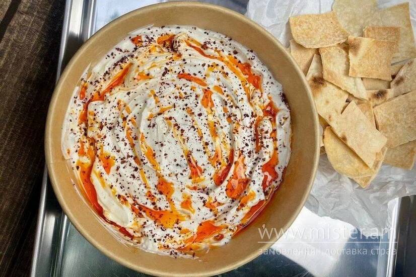 Ніжний йогуртовий сир, олія чилі, чіпси з лавашу.