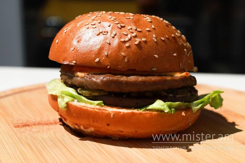 Булка Бріош, соус фірмовий, дві котлети, салат айсберг, чеддер, маринований огірок.