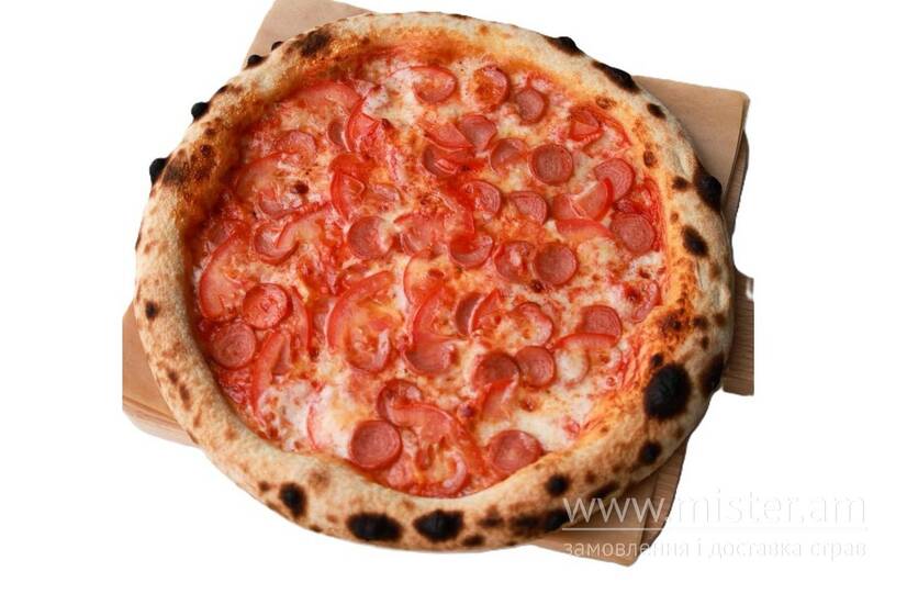 Ферментоване тісто, соус пелаті, моцарела, помідор, сосиски.