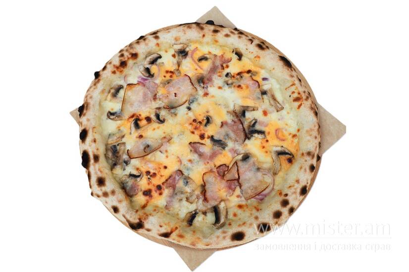 Ферментоване тісто, бешамель, моцарела, гриби, чеддер, бекон, маринована цибуля.