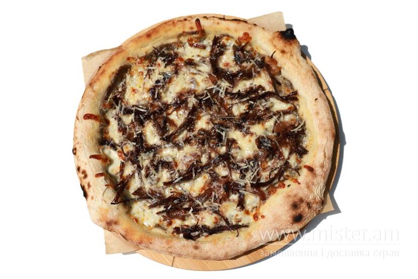 Ферментоване тісто, соус трюфельний, моцарела, смажені гриби з цибулею, яловичина су-від, пармезан.