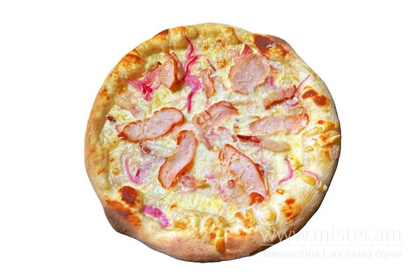 Соус вершковий, сир моцарела, цибулька маринована, філе куряче копчене, бекон, прованські трави.