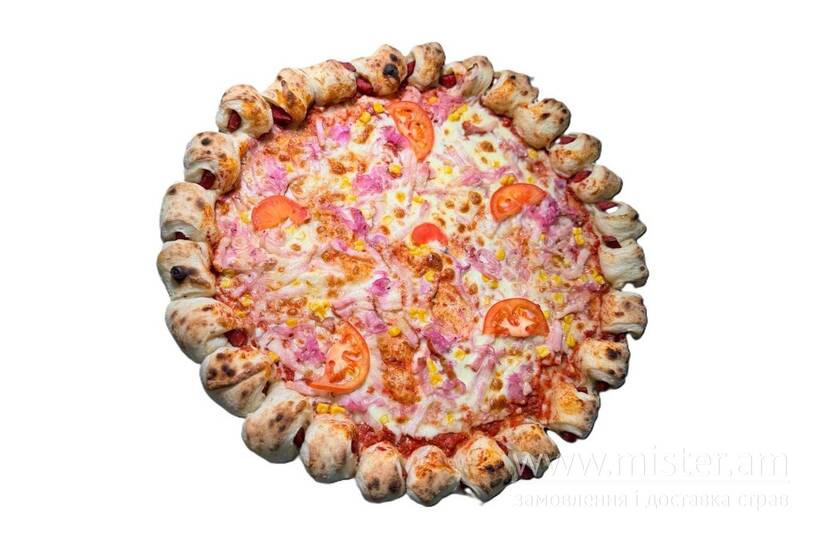 Соус пілаті, моцарела, кукурудза консервована, цибуля червона маринована, томати свіжі, бекон, бортик з кабаносами.