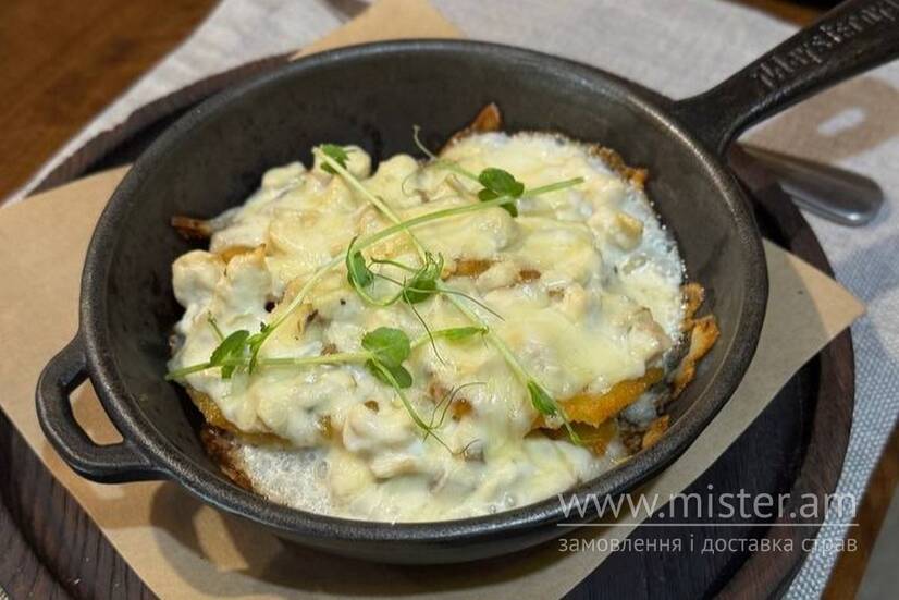 Деруни, курка, печериці, вершковий соус, моцарела.